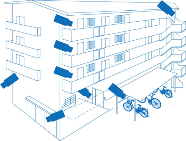 建物内外のカメラ映像を守衛室のモニターなどで監視することが出来ます。